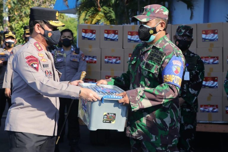 Tribratanews.polri.go.id – Makassar. Kapolda Sulsel Irjen. Pol. Drs. H. Merdisyam M.Si., bersama Pangkoops AU II Masda TNI Minggit Tribowo S.I.P yang merupakan satu alumni Akabri angkatan tahun 1991, melakukan bakti sosial berupa penyerahan bantuan paket sembako secara simbolis bersama TNI – Polri mengabdi untuk Negeri, 30 tahun pengabdian Akabri 1991.