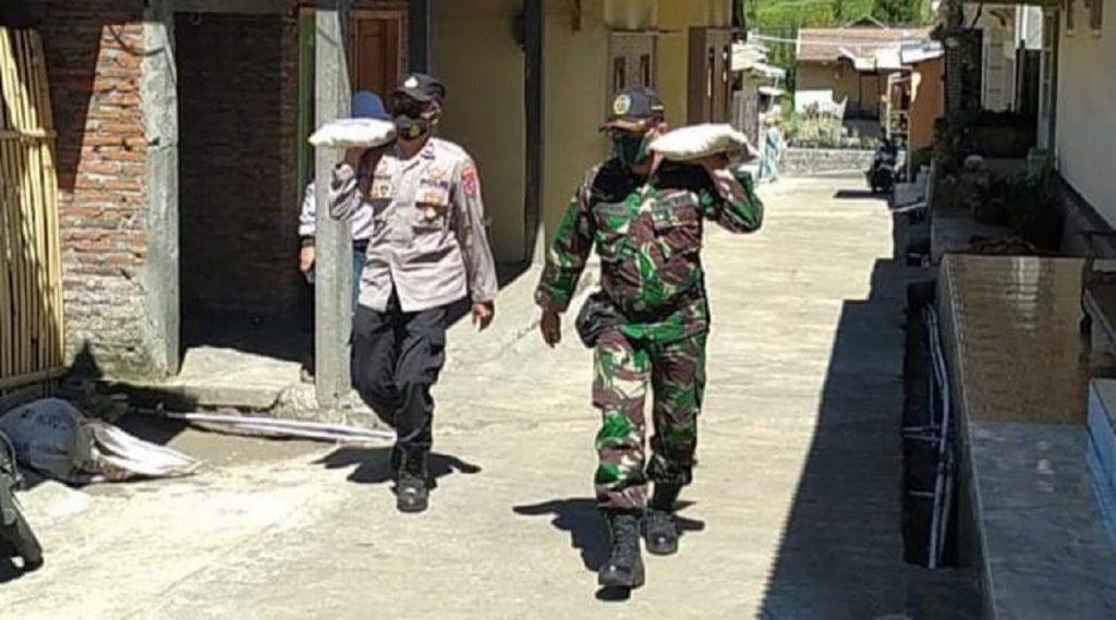 Disela-sela menyalurkan bansos, terlihat kebersamaan dan sinergitas TNI-Polri dalam melakukan kegiatan penyaluran bantuan sosial kepada masyarakat. Demikian yang diungkap Danramil 0820/08 Sukapura, Kapten Arh Heri Widodo