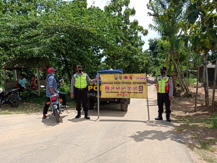 Polrestuban.com – Polres Tuban Polda Jatim | Guna mencegah Penyebaran Virus Corona di wilayah Kecamatan Grabagan, pada hari Senin tanggal 12 Juli 2021 sekitar pukul 10.00 Wib Anggota Polsek Grabagan Polres Tuban melaksanakan Patroli Physical Distancing dan berikan himbauan di Pertigaan Lapangan Wage Desa Grabagan Kec. Grabagan Kab. Tuban.