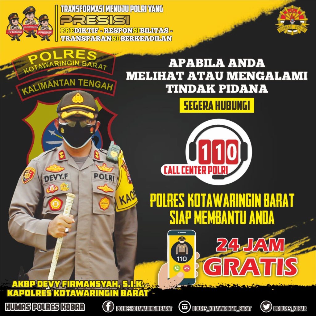 Layanan 110 tersebut juga sebagai bentuk wujud percepatan pelayanan kepada masyarakat, maka para personel Polres Kotawaringin Barat (Kobar), Polda Kalteng, gencar mensosialisasikan tentang keberadaan Call Center yang telah disediakan untuk memberikan kemudahan kepada masyarakat pada saat membutuhkan kehadiran Polisi tanpa harus datang ke kantor.